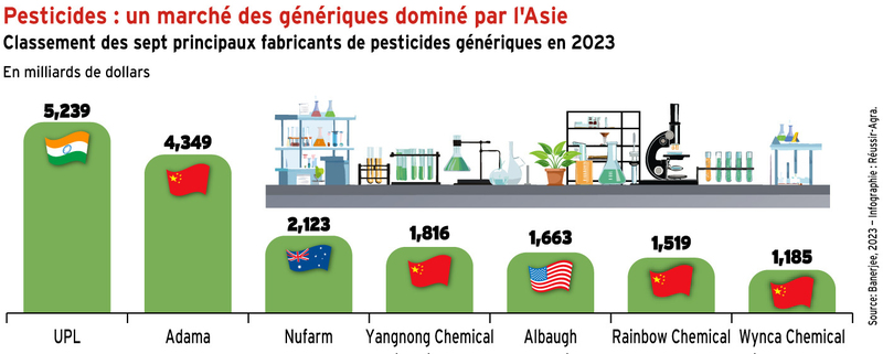 Dans une étude publiée dans la revue Journal of agrarian change, repérée par le CEP (ministère de l’Agriculture), des chercheurs suisses et américains documentent la place croissante de la Chine dans le marché des pesticides génériques, c’est-à-dire des produits comprenant des molécules dont le brevet est arrivé à échéance. Parmi les sept premiers producteurs de pesticides génériques en 2021, quatre étaient Chinois. En 2023, 39 usines usines de génériques à base de glyphosate (sur 77 dans le monde) étaient implantés en Chine (12 dans le reste de l’Asie, neuf en Inde, cinq en Europe de l’Ouest, deux aux Etats-Unis). Pour le Dicamba (interdit en Europe), deux des quatres usines dans…