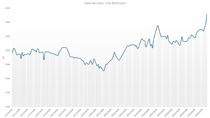 Après près de deux mois de conflit, la guerre en Iran a désormais provoqué une augmentation durable des prix de l’énergie. Les négociations entre Téhéran et Washington sont en effet toujours dans l’impasse et les infrastructures au Moyen-Orient ont subi des dégâts qui risquent de maintenir des flux d’exportations réduits en provenance de la région, même en cas de réouverture du détroit d’Ormuz. Une demande croissante de l’industrie du biodiesel est ainsi déjà constatée, que ce soit en Amérique du Nord, du Sud, en Asie du Sud-Est ou même en Europe. Les prix de l’huile de colza et de tournesol à Rotterdam enregistrent par conséquent, eux aussi, une rapide montée depuis plusieurs semaines.