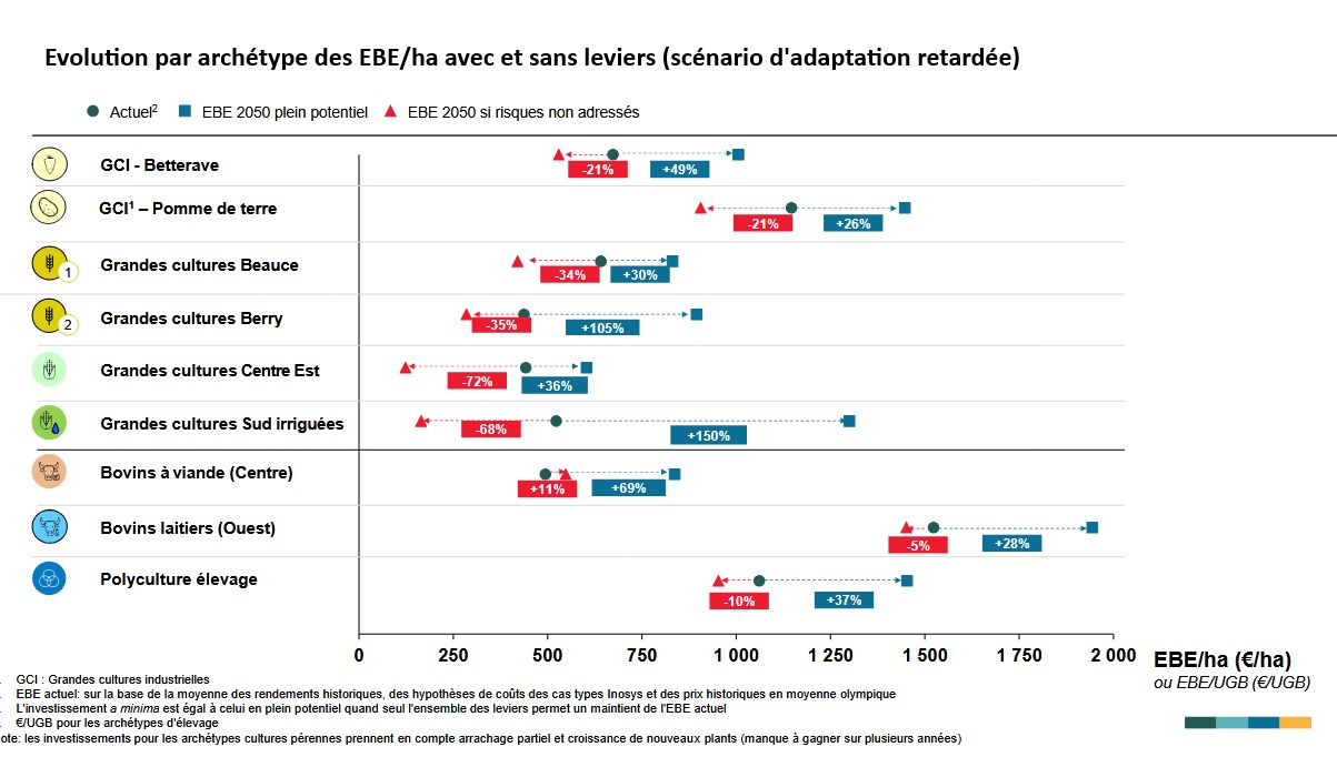 Là où les exercices de prospective agricole s’intéressent le plus souvent à la macroéconomie (productions, rendements, usages de terres…), quatre groupes français du secteur agricole ont réalisé un travail inédit de microéconomie. Le Crédit agricole, InVivo, Sofiproteol et Unigrains ont modélisé, avec McKinsey, ce que pourrait devenir la rentabilité des exploitations françaises conventionnelles à horizon 2050, selon trois scénarios. Dans un scénario dit « d’adaptation retardée » (+ 2,3°C), les rentabilités (EBE) par hectare chutent si les pratiques n’évoluent pas, de 5 à 72 % selon les types de fermes. Les grandes cultures irriguées du Sud et celles du Grand Est seraient très touchées. La dynamique est différente à l’échelle de l’exploitation dont la taille grandit : seuls quatre systèmes sur neuf voient leur EBE reculer. Les trois archétypes liés à l’élevage (bovins viande, lait et polyculture) progressent même, grâce à l’agrandissement qui bénéficie aux cultures de vente. Pour rétablir les rentabilités à l’hectare, les auteurs proposent des leviers d’adaptation (nouvelles cultures, photovoltaïque, Cive…) qui permettraient un maintien, voire une amélioration de la rentabilité à 2050. Mais ces schémas butent rapidement sur la capacité d’endettement des exploitations, face à laquelle les auteurs appellent à une mobilisation des filières et de l’État.